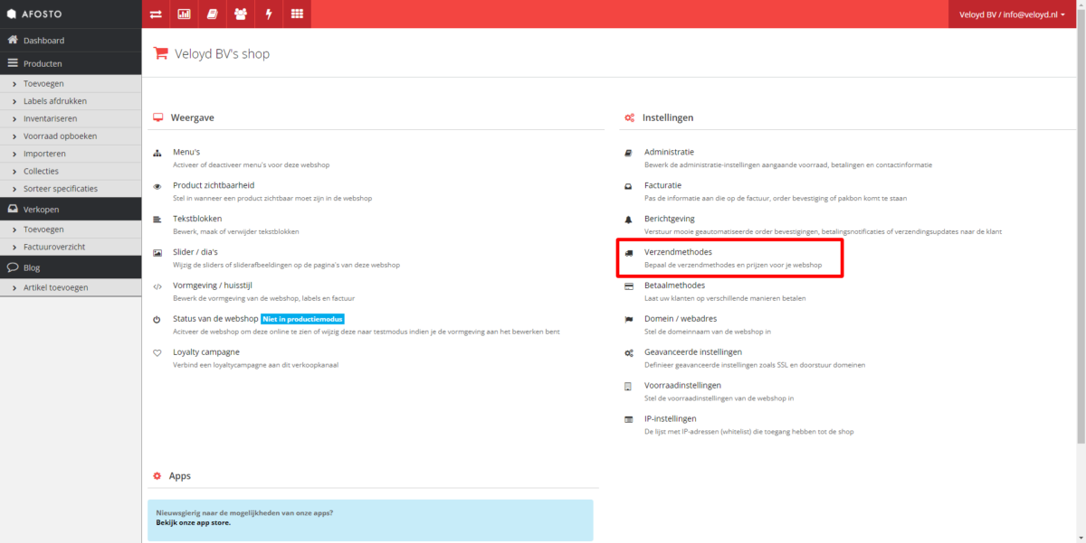 - Ga via Instellingen (rechtsboven) naar Verzendmethodes