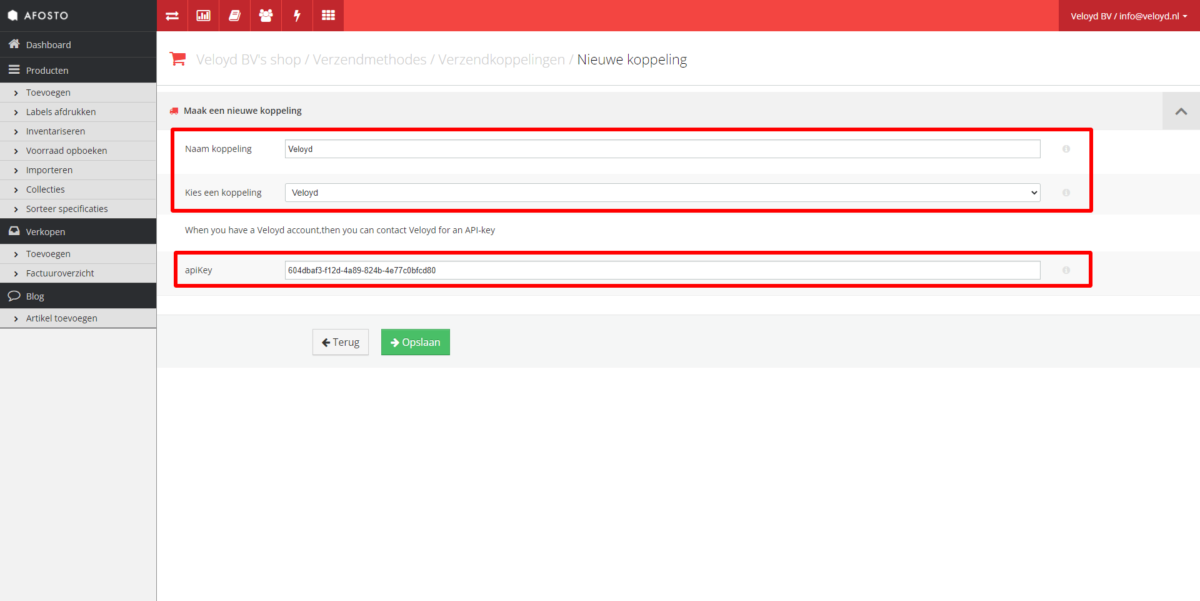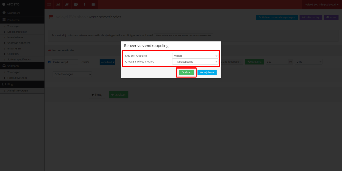 - Kies Veloyd bij koppeling en selecteer de juiste verzendoptie