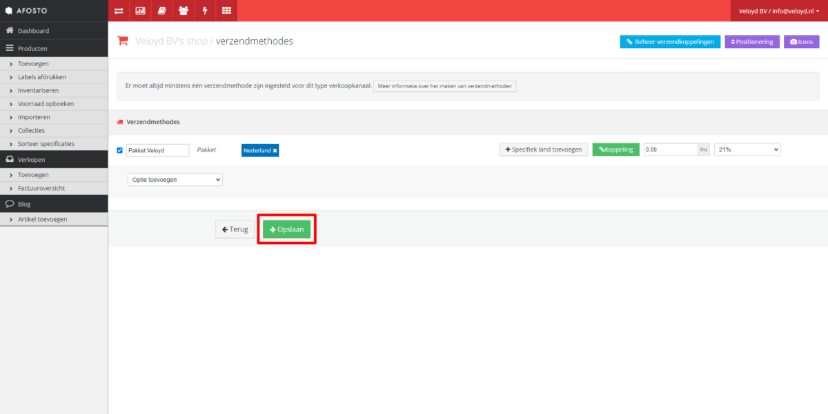 - Maak verzendmethodes aan zoals ‘Veloyd Pakket’ of ‘Veloyd Handtekening voor ontvangst’