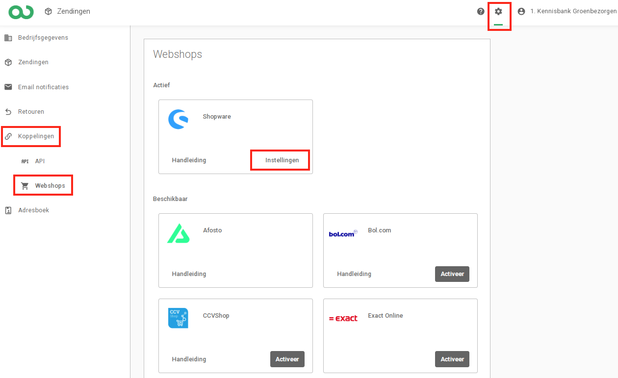 - Ga naar Instellingen (rechts boven), Koppelingen (links), Webshops (in het submenu onder Koppelingen) en dan Shopware > Instellingen