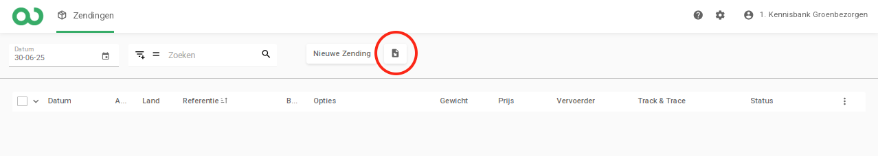 Klik op de knop ‘Importeren’ in het zendingenscherm, zie rode cirkel op onderstaande afbeelding.