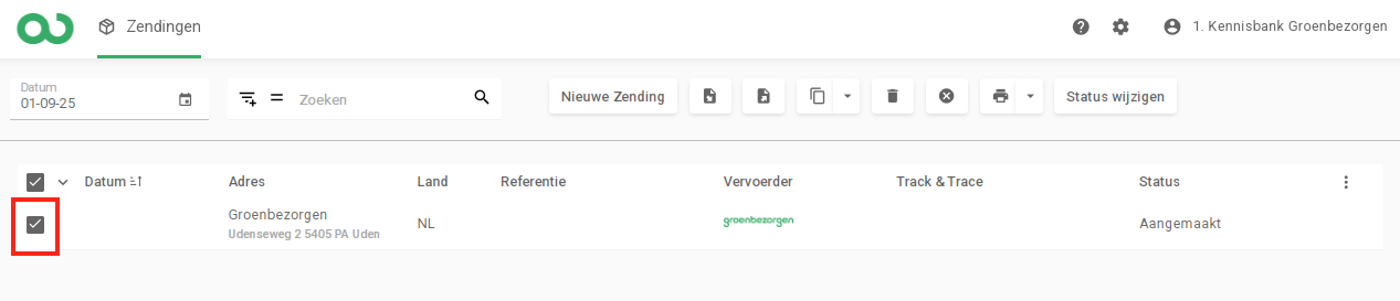 - Vink het lege vierkantje aan helemaal links in de rij van de zending