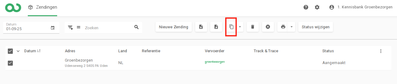 Klik hierop om één nieuwe zending te maken met exact dezelfde gegevens en instellingen als de geselecteerde zending.