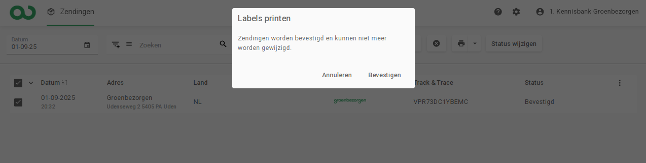 Zodra je een zending hebt bevestigd in het Groenbezorgen verzendportaal, is het tijd voor de laatste stap: het printen van het verzendlabel. Dit label plak je vervolgens op het te versturen pakket, brievenbuspakket of aangetekende brief.