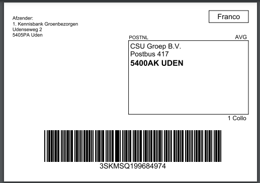 Zodra je de zending hebt bevestigd, kun je het verzendlabel uitprinten via het Groenbezorgen verzendportaal. Plak dit label op de te versturen envelop of het pakket. Het label bevat de Track & Trace-barcode zodat de zending eenvoudig te volgen is.